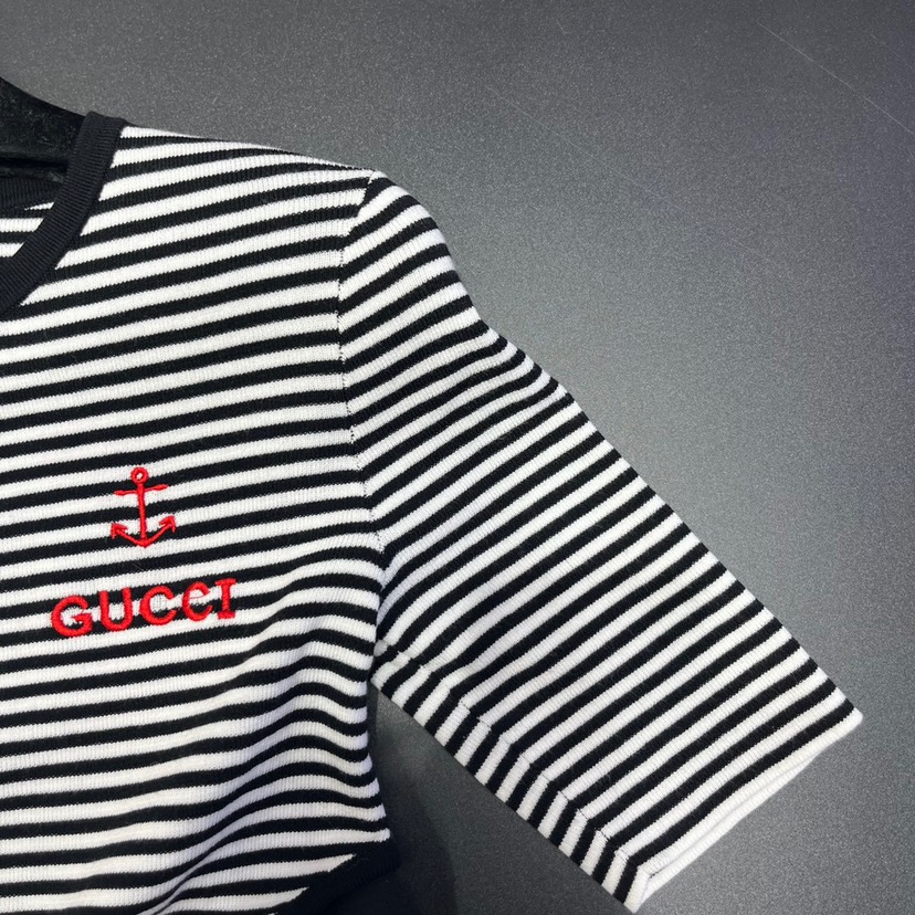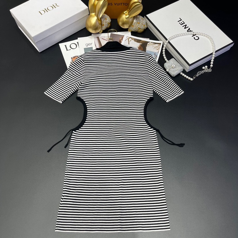 Home / New Gucci 23 Spring/Summer New Contrast Stripe Hollow Waist Letter Knit Dress